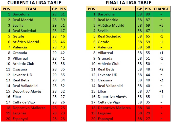 The current situation in La Liga is as usual: Barcelona leads the way with 61 points and Real Madrid is right at their heels with 59, both with 28 games played. Sevilla has taken the challengers role and sticks to the third place with 51 points, but already 29 games under their belt. The pack chasing is a tight-knit group of six teams within six points, with the likes of Real Sociedad (47 pts), Getafe and Atletico Madrid (46), along with Valencia (43), Granada (42) and Villarreal (41) looking to secure the Champions League qualifying spot in the top four.