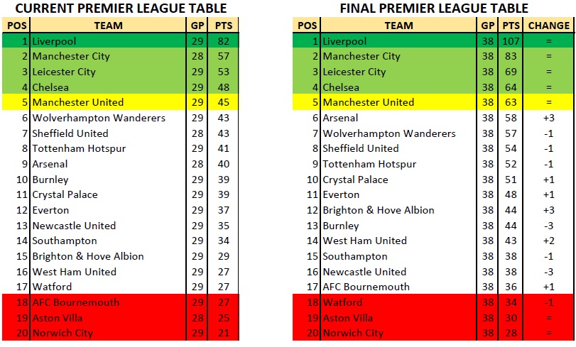 Rather surprisingly, not many surprises are expected for the rest of the strange season. The top five remains the same and in the same order, with Arsenal making a case for themselves, climbing three positions. Arsenal were in great form before the forced pause, having lost only once in 10 games and winning three straight. How much of that form is left after a three-month-hiatus, who knows?
