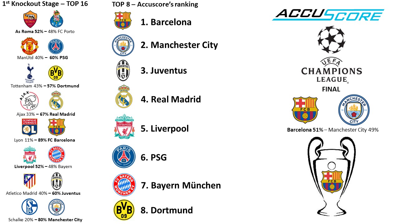 Here are Accuscore’s simulations for the 1st Knockout Stage and current power rankings of the top-8 participating teams. Injuries and suspensions – among others – are likely to mix the deck before the UEFA Champions League final on June 1st in Madrid, but we’ll adjust on the way.